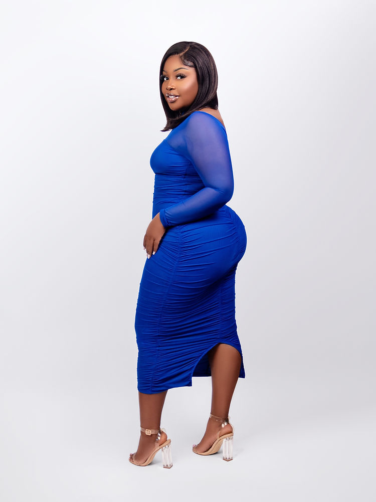 Meet Ashley the kind of dress that makes you feel like that girl the second you put it on. Designed in a rich blue that flatters every skin tone, it hugs your body just right, showing off those curves without doing too much. The fit is snatched, the sleeves are cuffed, and it features a subtle cutout near the neckline that adds a little spice.