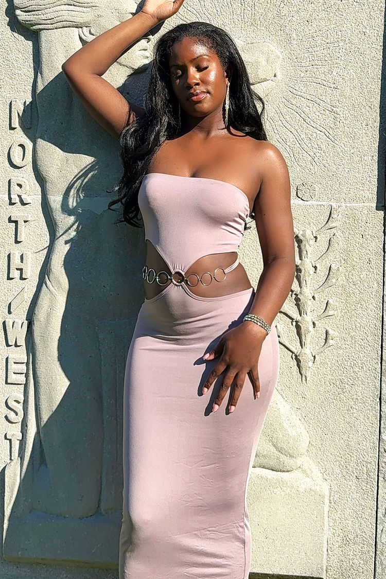 CYRÉA isn’t just a dress, it’s a full-body statement. This body-hugging mini features a bold stomach cut-out connected by seven silver chain loops that wrap from the front to the back, creating a sculpted, head-turning silhouette. The back is open below the bra line with adjustable ties for the perfect fit, while the soft, stretch fabric molds to every curve.