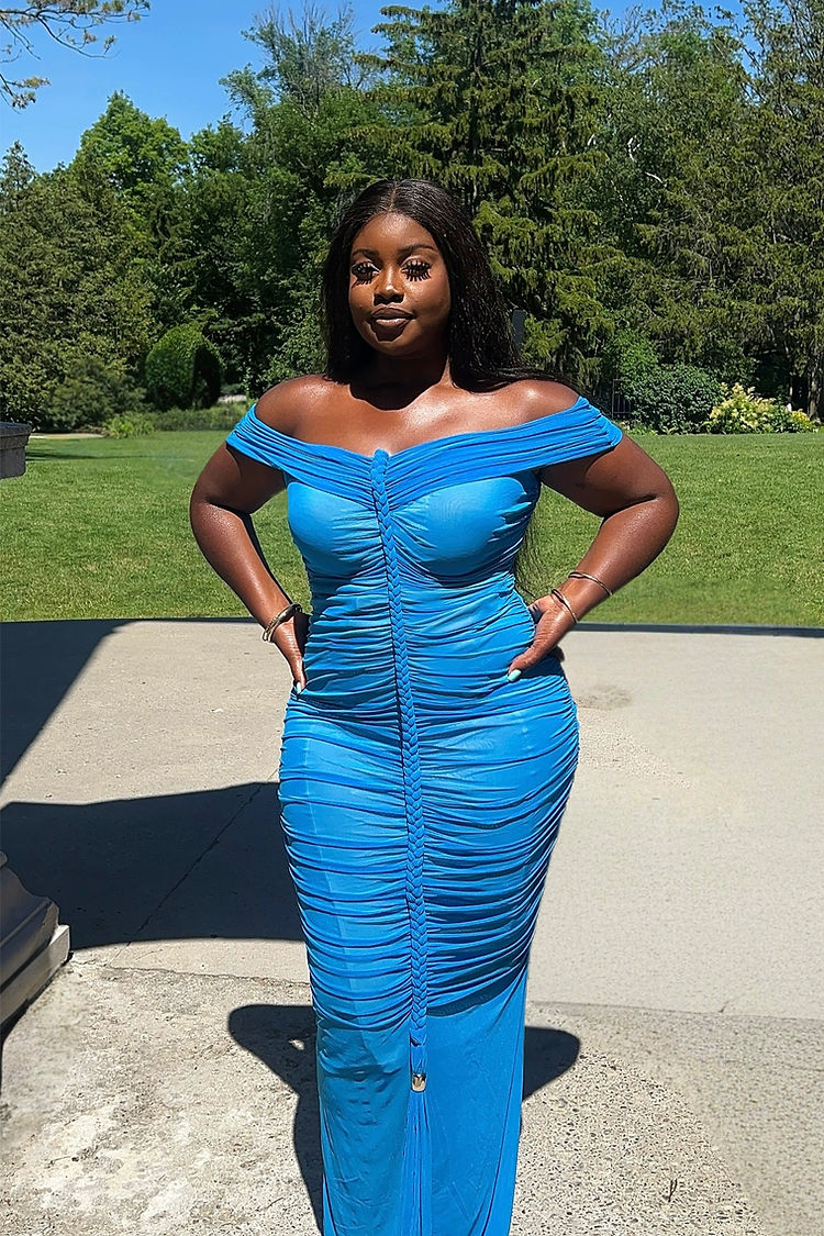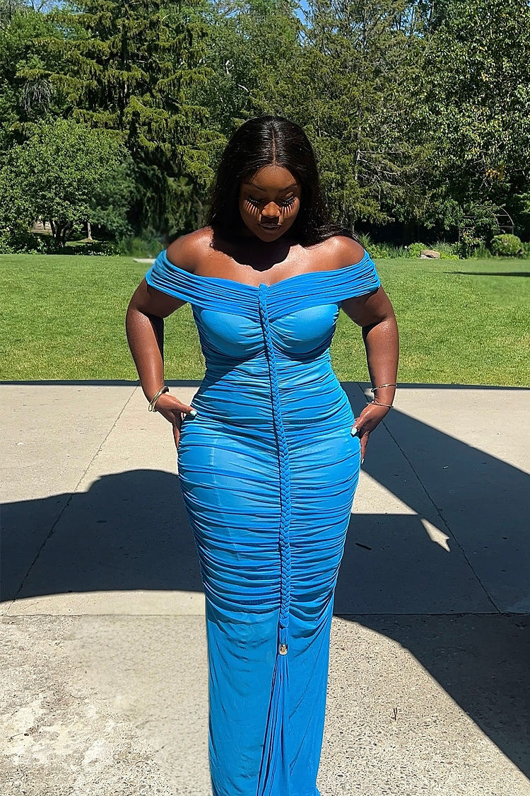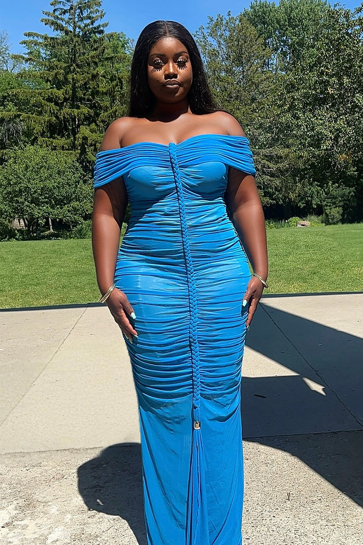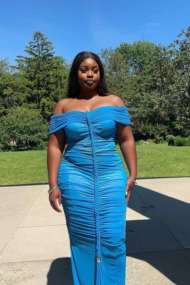 Own the night in MARÉA a deep turquoise masterpiece crafted to captivate. This goddess-inspired gown features sculpting ruching, knotted drape details, and a cascading silhouette that hugs every curve with intention. The soft mesh overlay adds movement and allure, while the double lining ensures comfort and coverage. Stretchy and statement-making, Maréa is your go-to for evenings that demand unforgettable glamour.