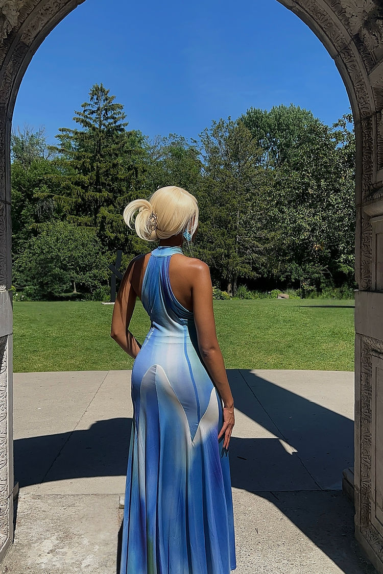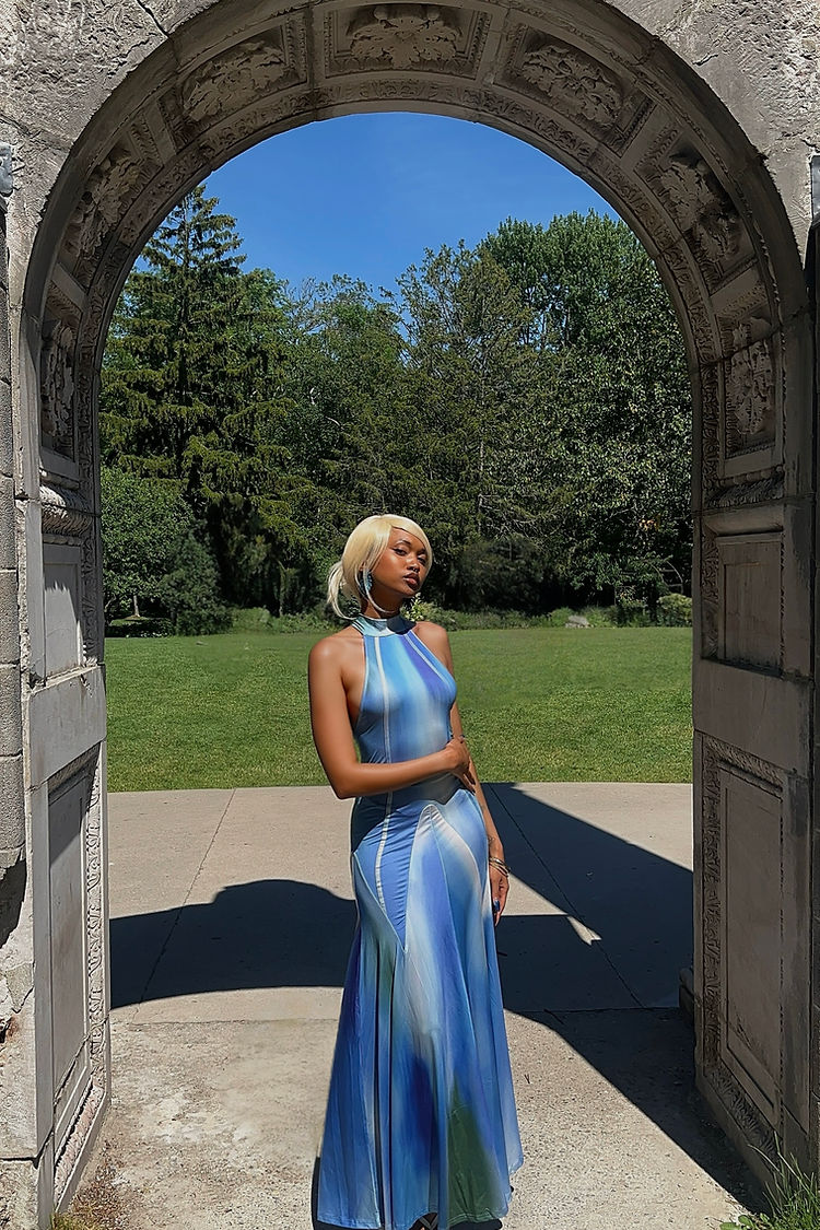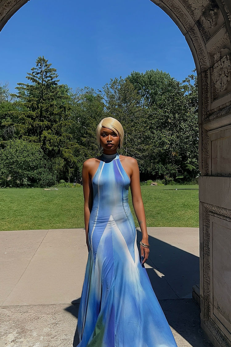 Sweet like summer air and bold like the sea — MIÉLA captures the essence of effortless luxury. Featuring a custom abstract print in mesmerizing shades of blue and green, this halter gown is designed with a flowing, ethereal silhouette that moves with grace and drama. The bodice offers a flattering, contoured fit with soft stretch, while the chiffon skirt glides effortlessly over the body, creating a stunning contrast of shape and fluidity.