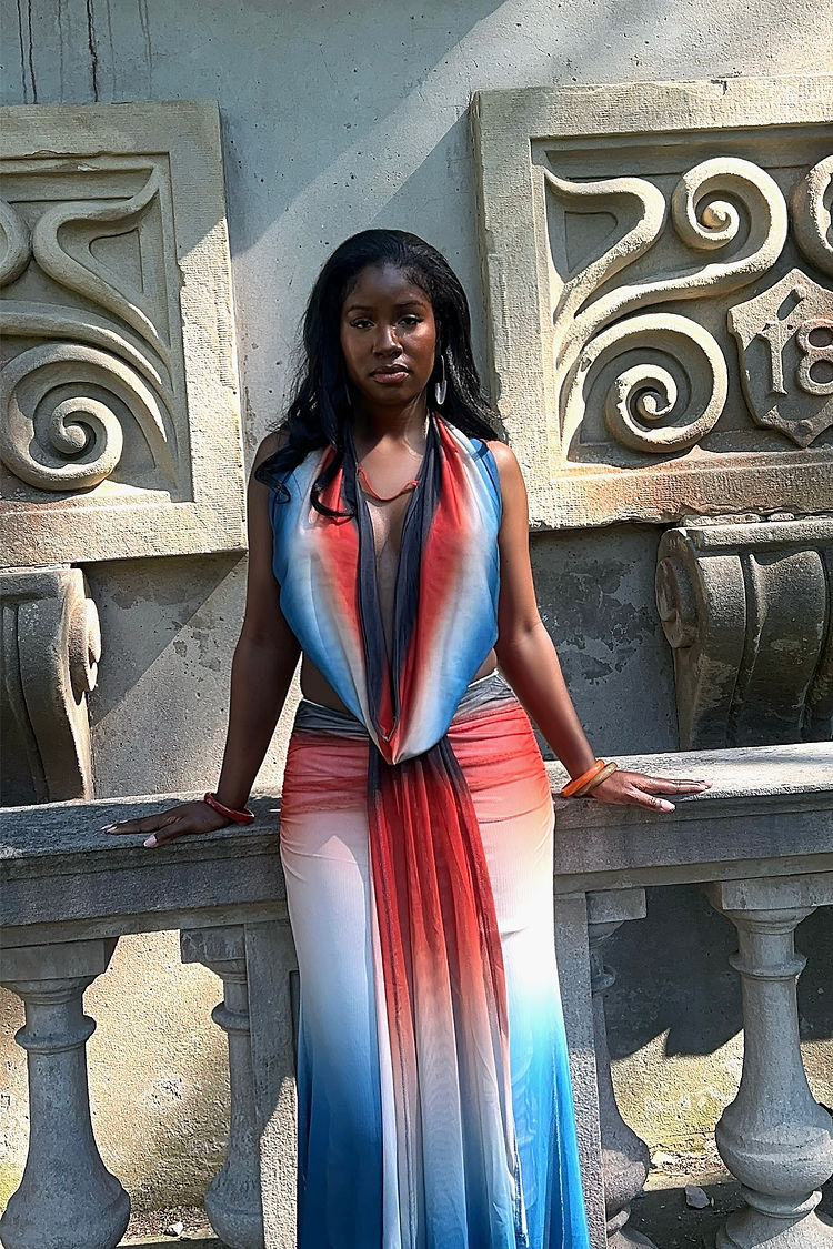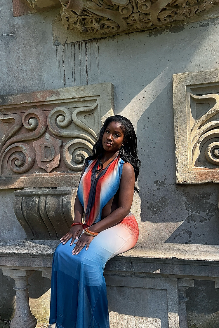 Elevate your sunset moments in ORÉA, a statement two-piece designed to stun. Bathed in a rich ombré blend of blue, fiery orange, and soft ivory, this set features a deep cowl halter top with an open back that ties to perfection. The coordinating maxi skirt hugs the body with flattering ruching and a flowing asymmetric drape, creating effortless movement with every step. Romantic, radiant, and unforgettable.