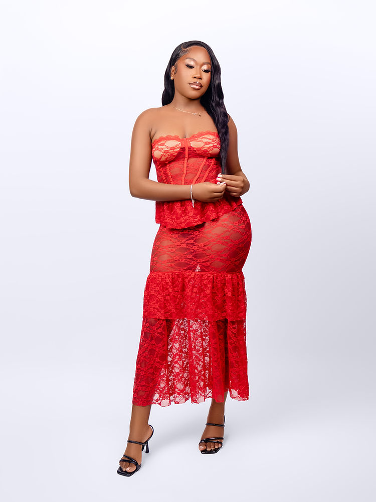 There’s a reason Suisha always gets a second look. Designed in rich, deep red and classic midnight black, she’s the kind of dress that makes you feel powerful the second you zip her up. The lace is soft with just the right amount of stretch, and the nude lining, built-in cups, and subtle boning give you that snatched, held-together feel without sacrificing comfort. The ruffles add a little flirt, but the overall vibe? Whether it’s a romantic night out or a special occasion, Suzisha is it!